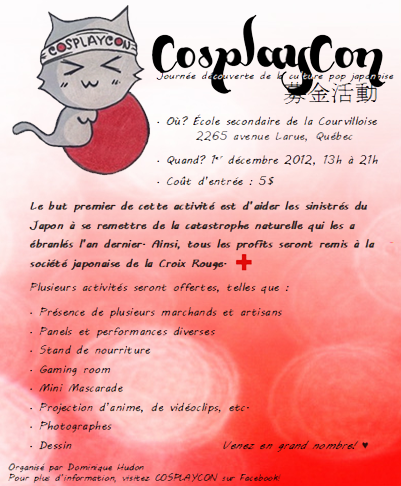 Je vous rappelle qu’il s’agit d’une activité organisée par Dominique Hudon, élève de 5e secondaire. Les fonds seront remis à la société japonaise de la Croix-Rouge.